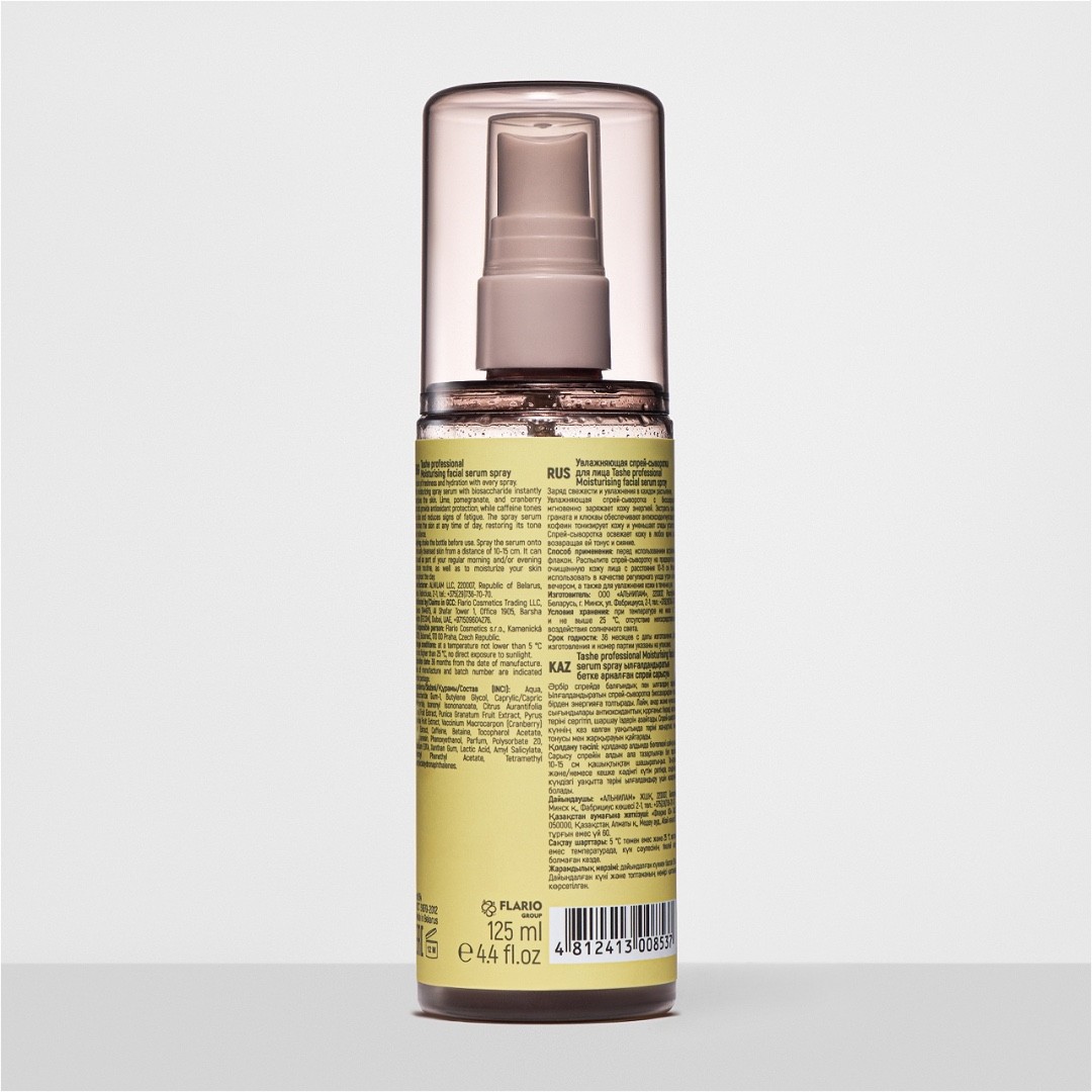 Увлажняющая спрей-сыворотка с биосахаридом мгновенно заряжает кожу энергией, возвращает ей естественное здоровое сияние. Экстракты лайма, граната и клюквы обеспечивают антиоксидантную защиту, кофеин тонизирует кожу и уменьшает следы усталости, снимает отечность.