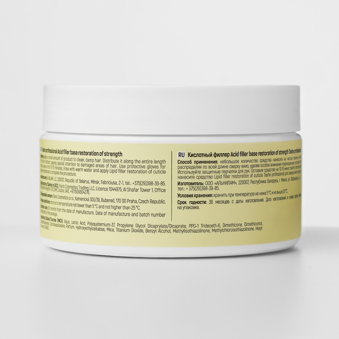 Кислотный филлер Acid filler base restoration of strength – профессиональный состав для процедур холодного восстановления сильно поврежденных волос по всей длине. Работает непосредственно на укрепление дисульфидной связи, благодаря большой концентрации молочной кислоты в составе. Восстанавливает волокна волоса, не давая им обламываться и быть хрупкими.