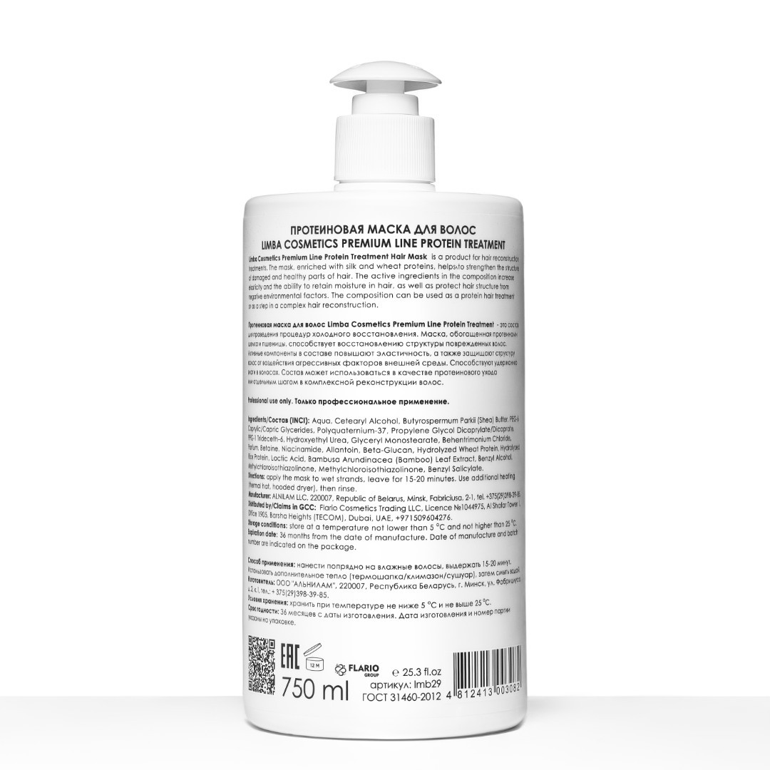 Протеиновая маска для волос Limba Cosmetics Premium Line Protein Treatment - это состав для проведения процедур холодного восстановления. Маска, обогащенная протеинами шелка и пшеницы, способствуют укреплению структуры поврежденных и здоровых участков волос. Активные компоненты в составе повышают эластичность и способность удерживать влагу в волосах, а также защищают структуру волос от воздействия агрессивных факторов внешней среды. Состав может использоваться в качестве протеинового ухода или отдельным шагом в комплексной реконструкции волос.